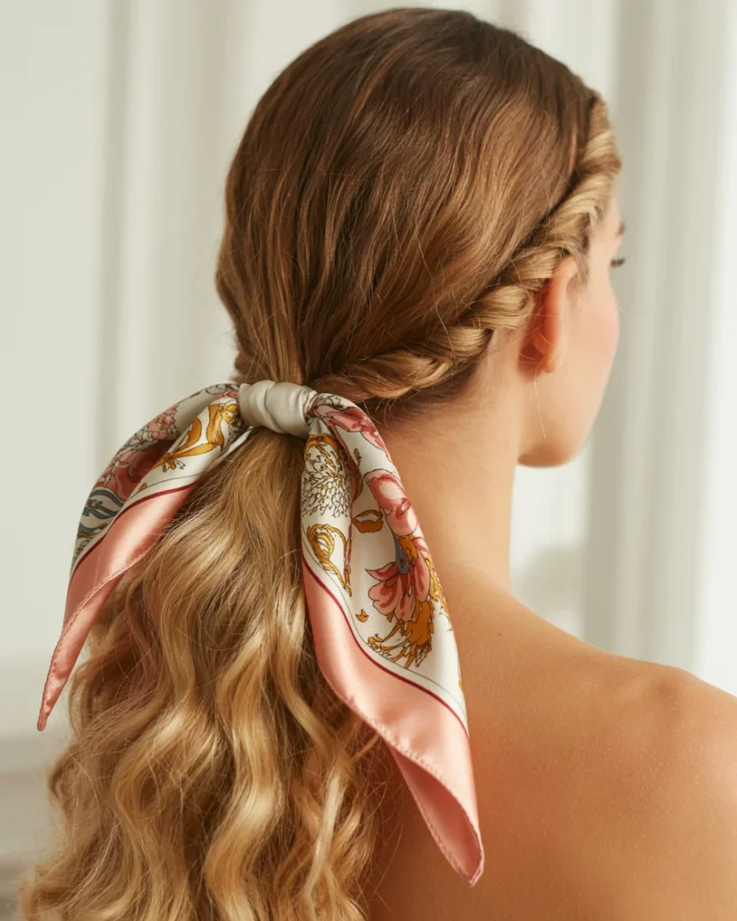 - Tie a silk scarf around the base of the ponytail, allowing the ends to hang down for a playful, vintage touch.
