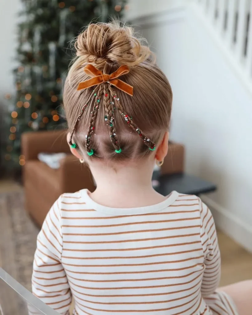 This festive and playful hairstyle features a cute top knot with delicate braids falling down the back, adorned with colorful hair elastics and a velvet bow. It’s a fun and stylish look perfect for holiday events, parties, or casual gatherings, with the added charm of holiday-inspired details like the green elastics and shimmering decorations.