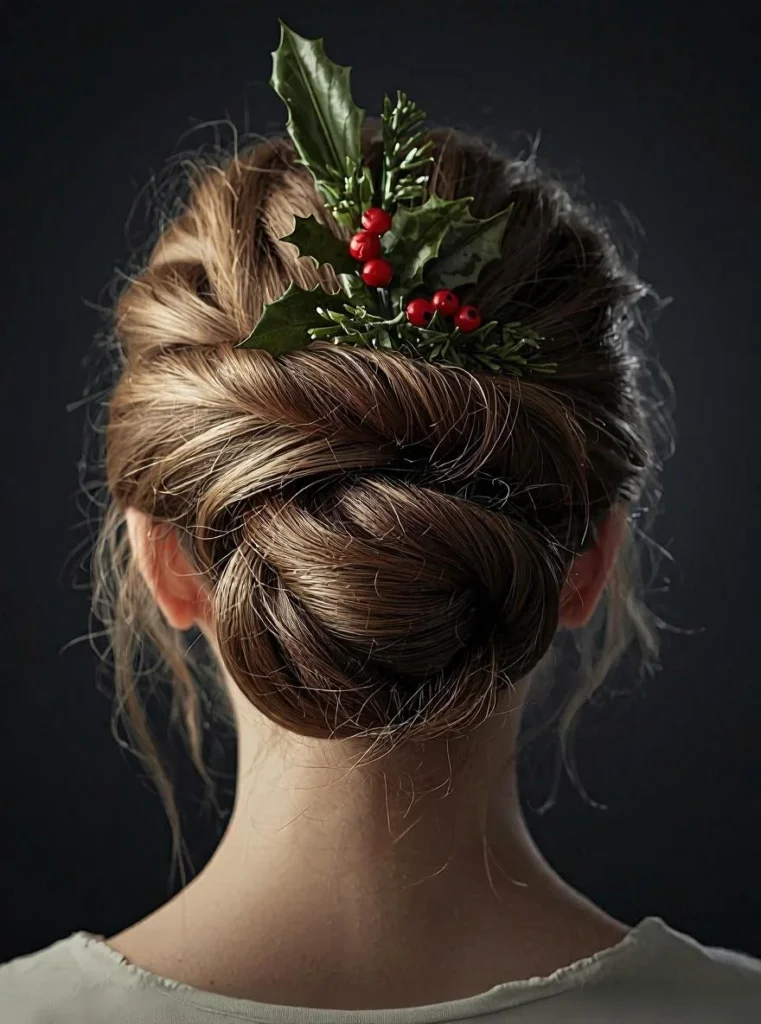 - Tuck a small sprig of faux holly, red berries, or evergreen leaves above the bun or on one side.