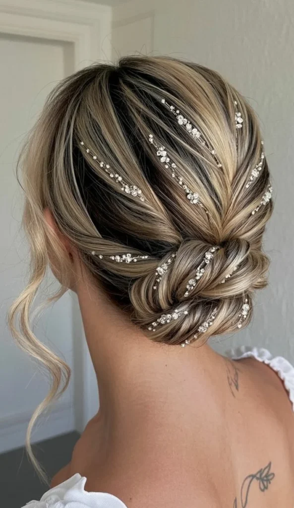 - Carefully place the crystal hairpins or small jewel embellishments throughout the twisted bun for a sparkling, luxe effect.