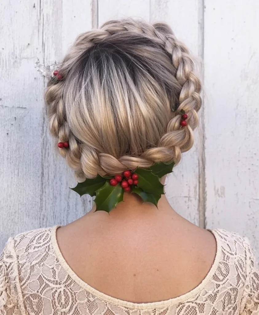 This charming updo features a beautifully braided crown, with the hair woven around the head to create an elegant, regal look. The crown is finished with festive holly leaves and bright red berries, giving it a playful, seasonal touch. Perfect for holiday parties, family gatherings, or any festive occasion, this hairstyle blends timeless elegance with holiday cheer.