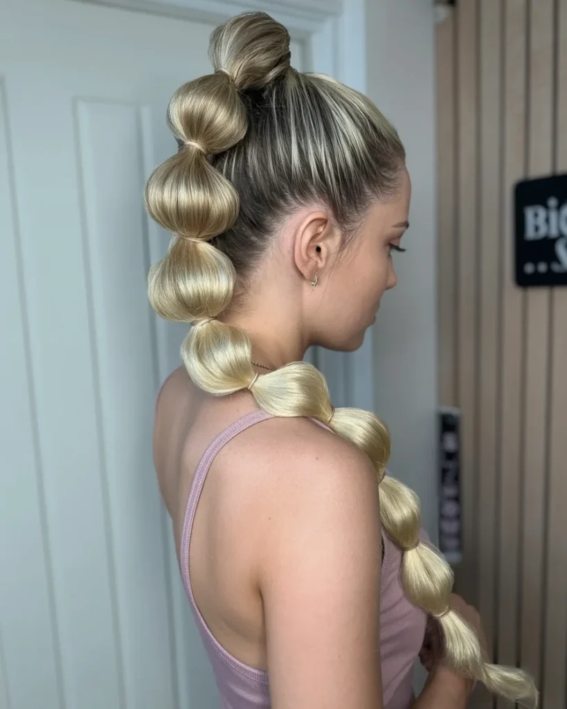 - For the bubble braid, gather sections of hair along the ponytail and tie them off with small elastics, creating bubbles between each knot.