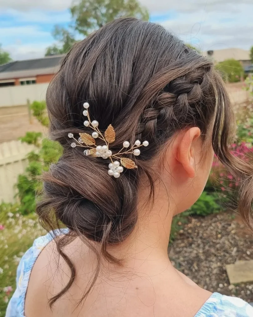Graceful and timeless, this braided low bun adds a touch of elegance to any look. The soft braid starts from the side and wraps seamlessly into a textured bun, creating layers of dimension and movement. A delicate pearl and gold hairpiece completes the style, adding a hint of sparkle without overpowering its simplicity.