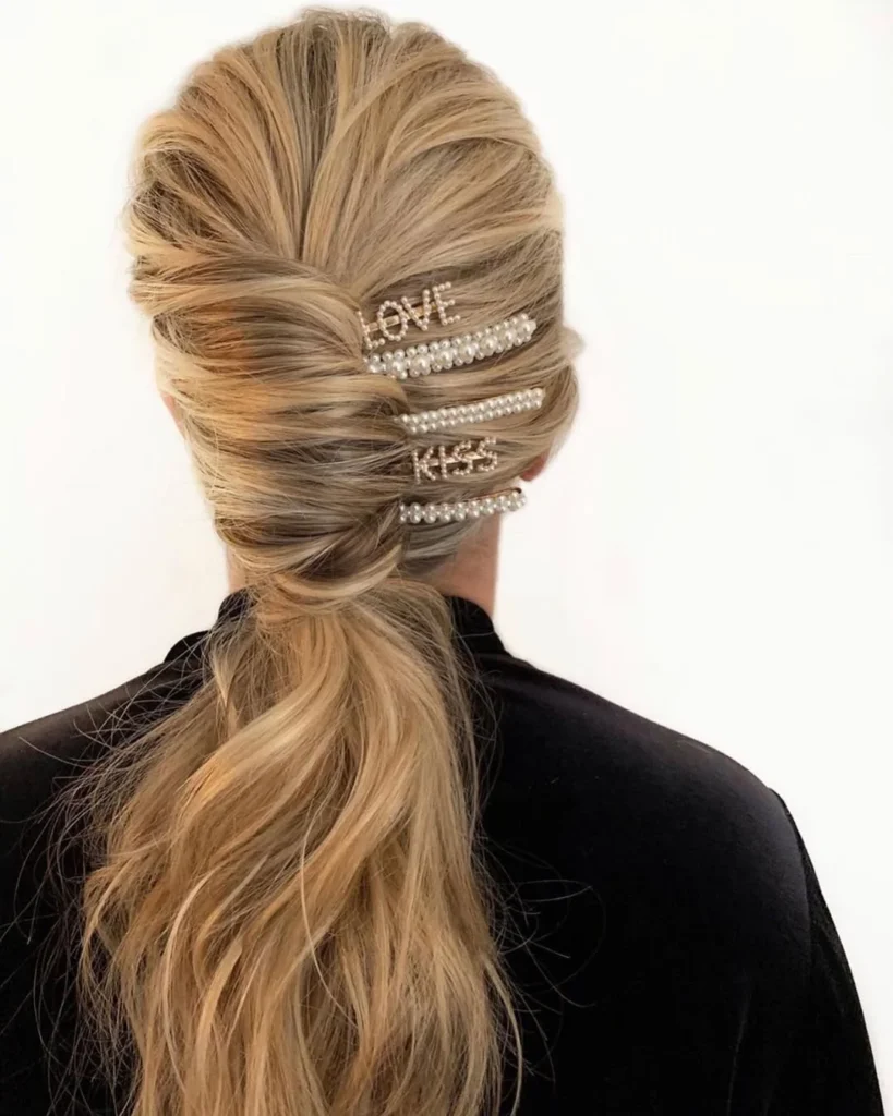 Delicate pearl clips spelling “Love” and “Kiss” add a romantic and modern touch, turning a simple hairstyle into a statement. The accessories bring a sense of playfulness while maintaining an elegant finish suitable for any special occasion.