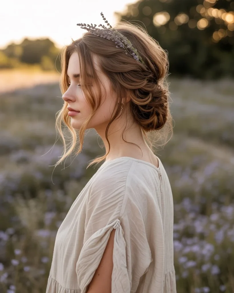 Sprigs of lavender tucked gently into the bun add a delicate, earthy touch. The muted purple tones pair beautifully with sunlit settings, giving this hairstyle a serene and romantic vibe.