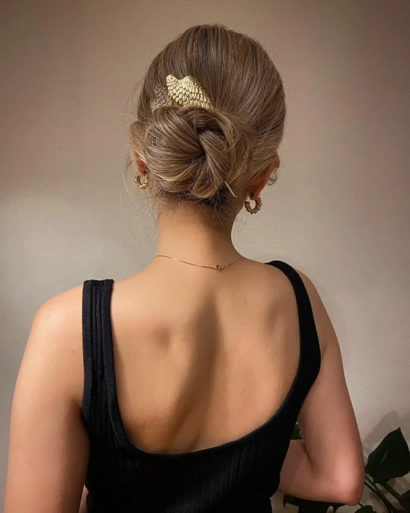 A golden hair clip with textured details adds a luxurious touch, catching the light and elevating the entire style. Its placement enhances the shape of the bun, turning it into a statement of grace and refinement.