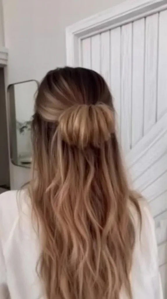 Soft, romantic, and effortlessly chic, the half-up twist bun is a go-to look for long hair. The hairstyle combines the beauty of loose waves with a simple knotted bun at the crown, creating a natural yet put-together appearance.
