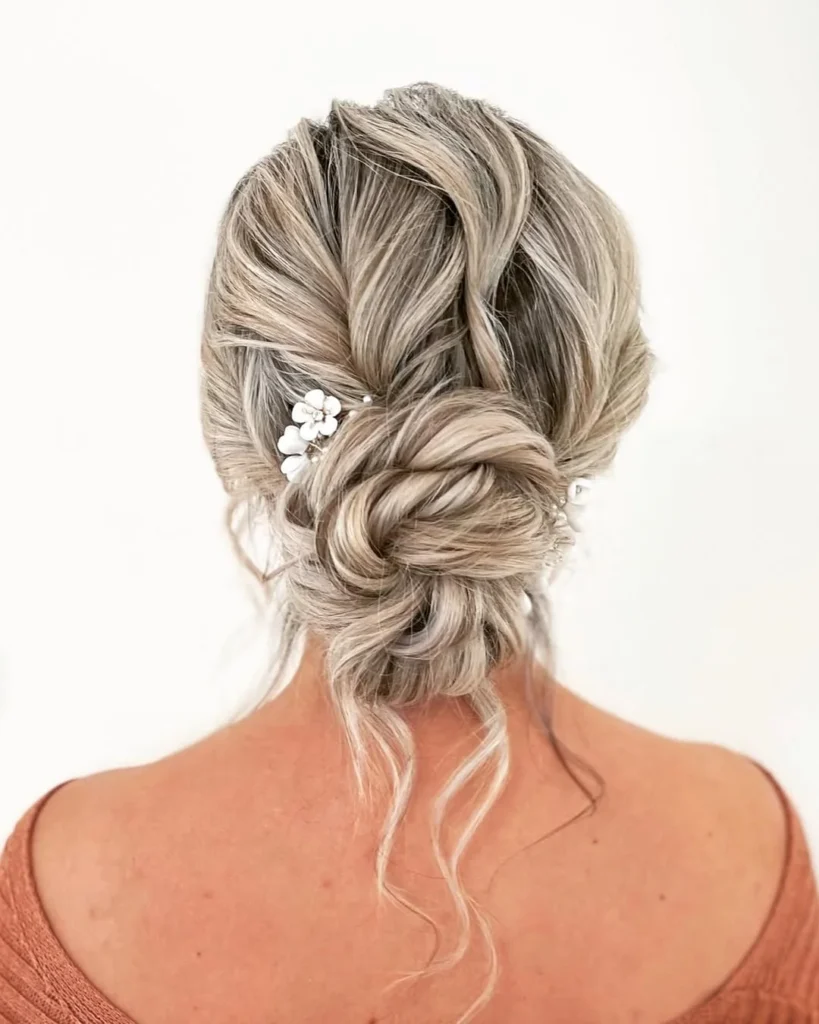 Soft twists and gentle curls come together in this romantic floral low bun. The hairstyle features loosely pinned waves that create a natural, graceful texture with effortless charm.