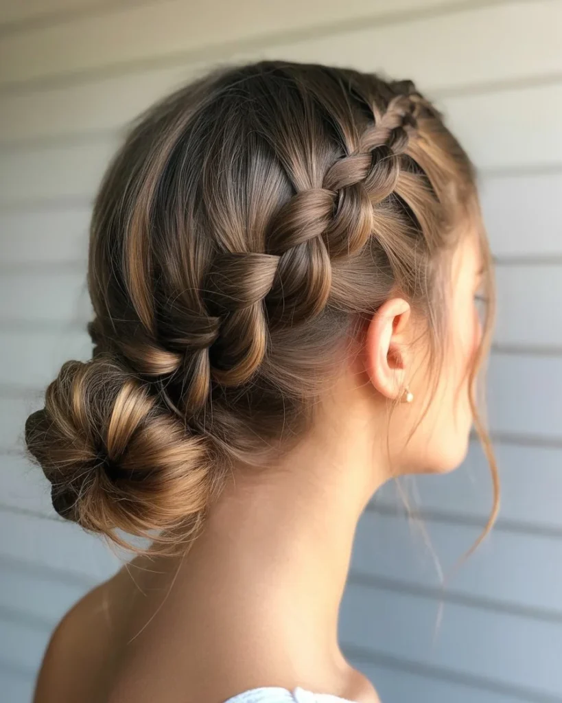 Braids and buns come together beautifully in this charming updo. The side braid starts softly near the crown, weaving across the head before blending into a low, twisted bun at the nape. The result is a graceful, textured look that feels both relaxed and polished.