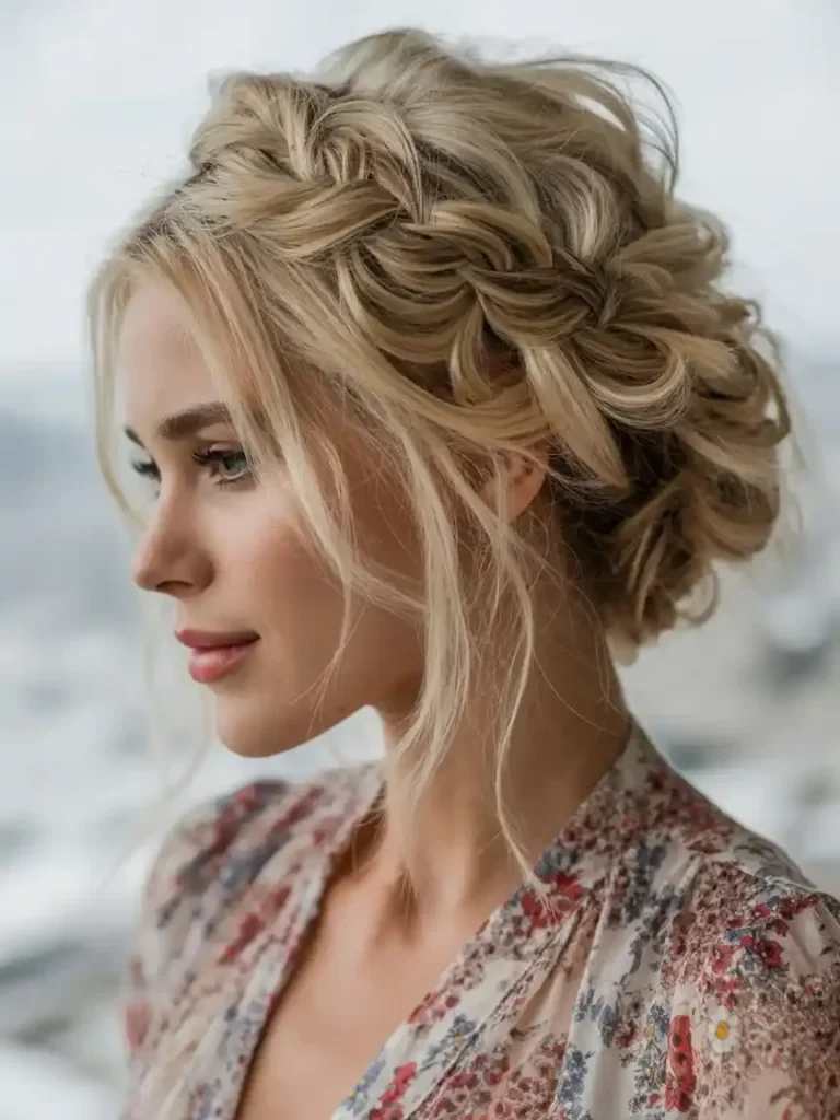 Softly braided from the crown, this updo blends texture and elegance in one beautiful style. The braid wraps around the head like a delicate crown, adding volume and structure while keeping the look romantic and airy.