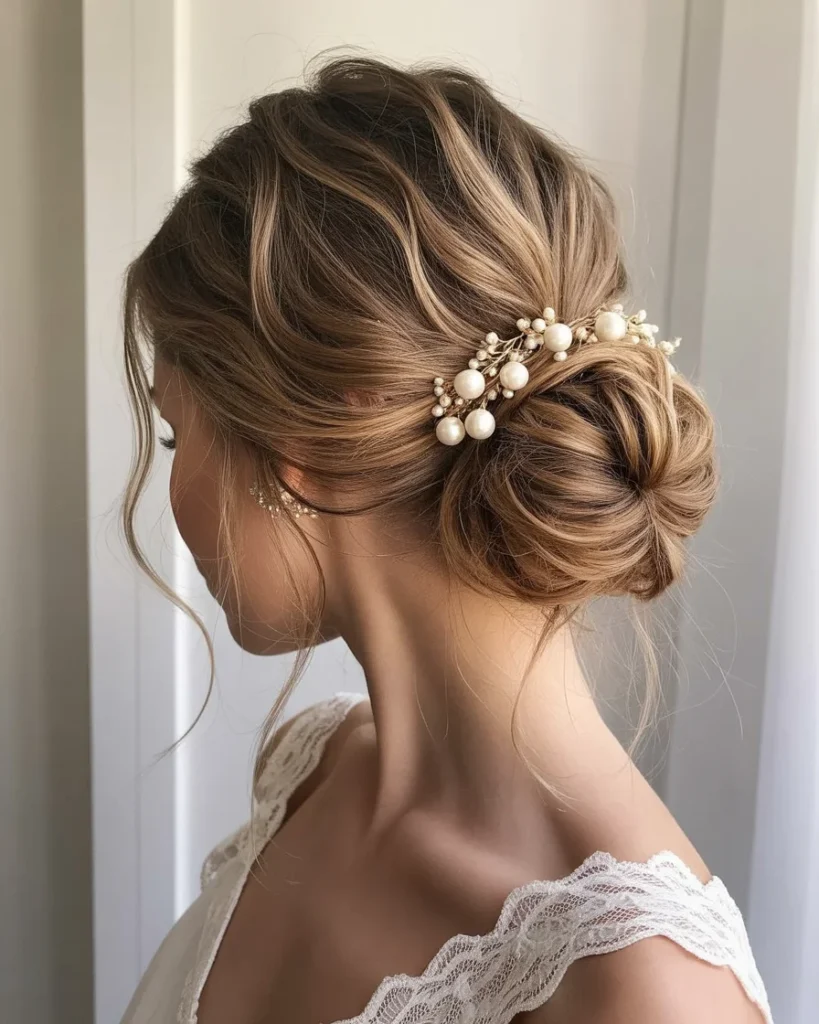 Delicate floral pins and pearl accents are woven into the bun, giving it a dreamy, ethereal touch that enhances its femininity. A few loose tendrils frame the neck and shoulders, creating a soft, graceful finish.