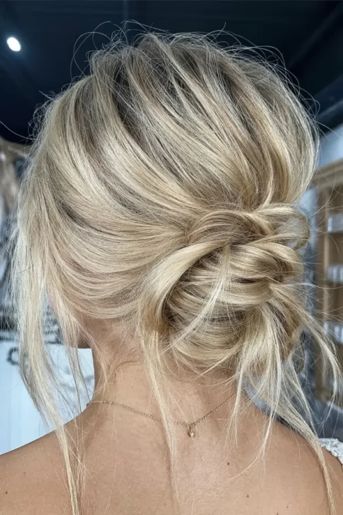 The tousled, voluminous look adds a playful vibe that pairs beautifully with a casual summer outfit. Loose strands fall naturally around the face, creating a soft, breezy effect that’s perfect for a beachside lunch or sightseeing. The top knot is both functional and chic, keeping your hair neatly in place without looking too structured.