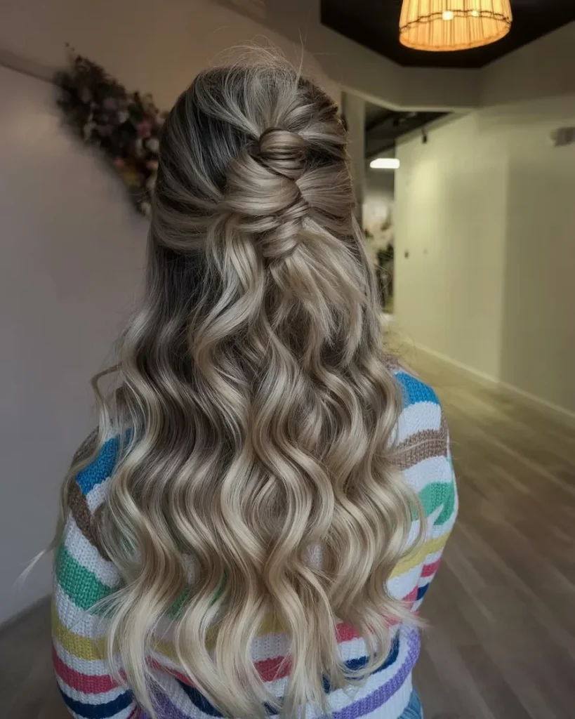This soft wavy half updo is an effortlessly chic vacation hairstyle that combines relaxed waves with a hint of elegance. The hair is styled with gentle waves that add volume and movement, while the top section is subtly twisted into a half-up knot, creating a sophisticated yet playful look.