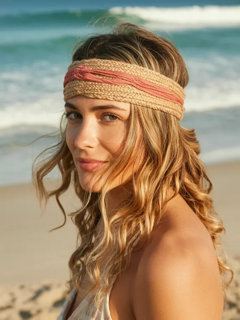 This beachy hairstyle with a braided headband adds an effortless, chic touch to any vacation look. The soft, tousled waves give off a relaxed vibe, perfect for beach days or casual outings.The braided headband brings a fun, boho element that not only adds style but also keeps the hair away from the face, making it practical in windy or hot conditions.