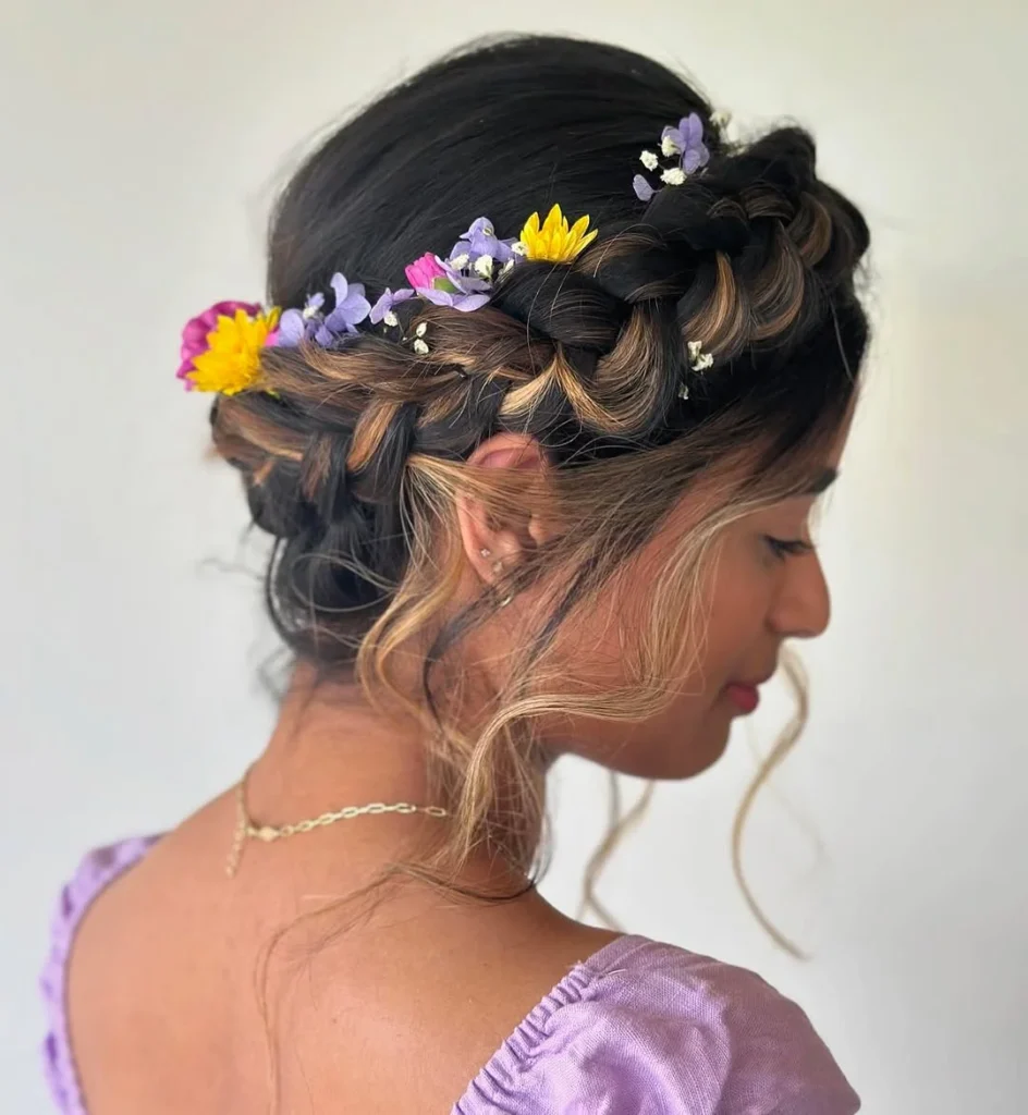 This beautiful vacation hairstyle combines a classic braid with a touch of nature. The floral crown braid wraps around the head, giving a soft and romantic look that’s perfect for any outdoor occasion. The braid itself is neatly woven, but the addition of delicate, colorful flowers transforms it into a statement piece.