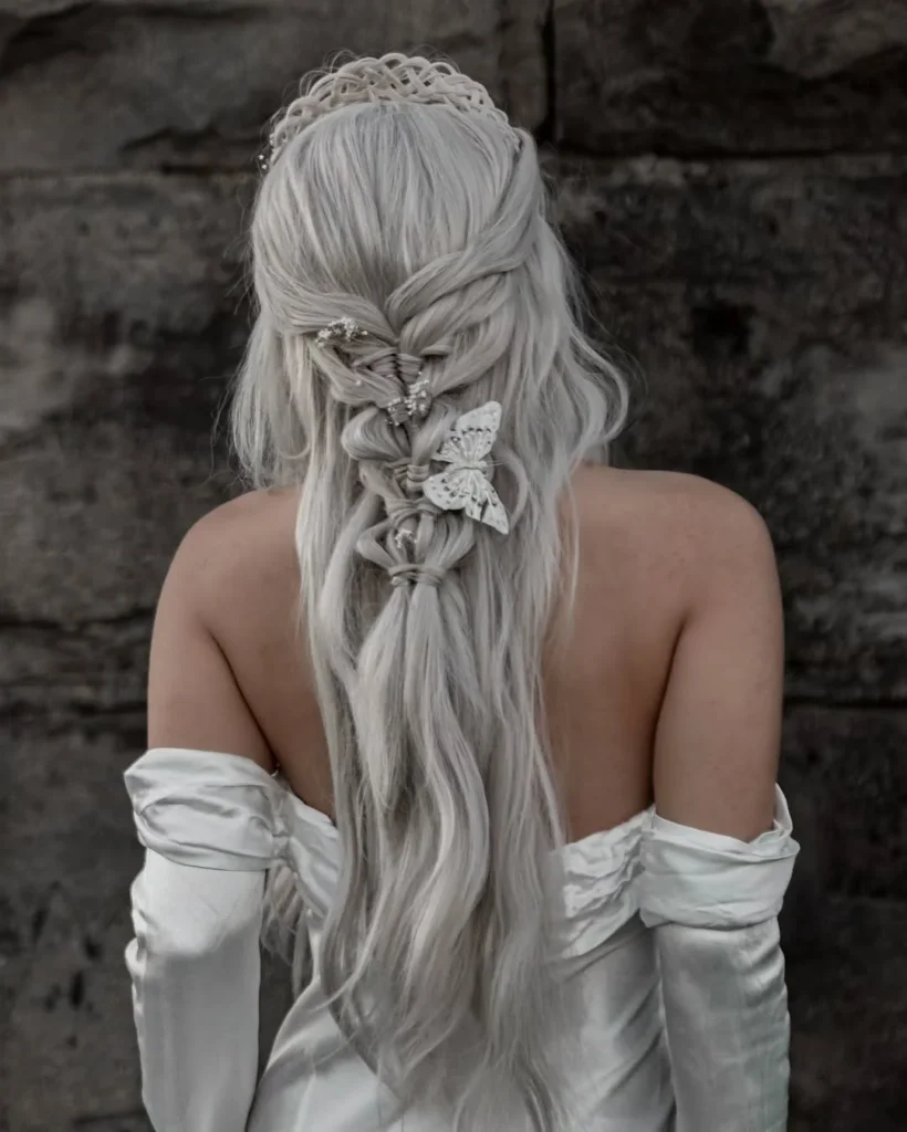 The hair is styled with a half-up, half-down approach, where the top section is braided and pinned in place, while the lower section flows freely. The addition of a decorative crown completes the look, making it ideal for special occasions or vacations where you want to feel truly glamorous.
