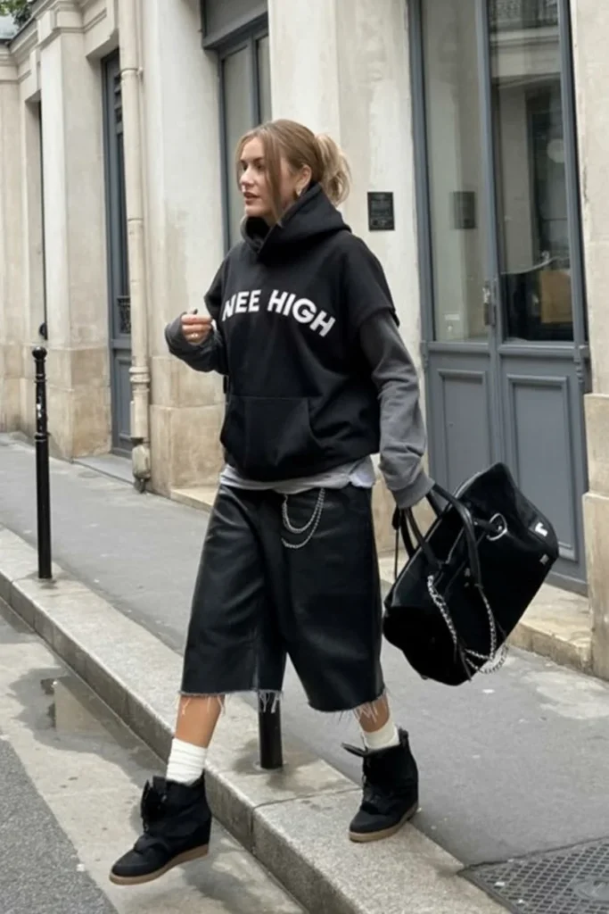The black leather shorts bring an urban feel, adding a touch of edge to the outfit. Completing the look are the wedge sneakers, which provide height without sacrificing comfort, perfect for a stroll around the city or a casual outing.