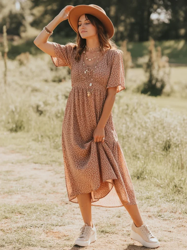The accessories—a layered necklace and a wide-brimmed hat—add a touch of sophistication and practicality, perfect for sunny days. This outfit proves that wedge sneakers aren’t just for casual wear but can be paired with dresses for a chic, effortless look. Whether you’re exploring the city or meeting friends, this outfit is a fresh and stylish option for any occasion.