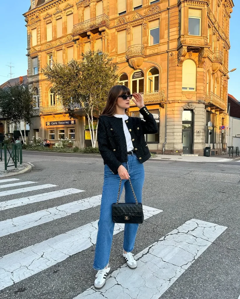 This ensemble offers a chic yet casual vibe, where wedge sneakers perfectly complement the outfit. The black tweed jacket adds a tailored, sophisticated touch, contrasting beautifully with the relaxed fit of the high-waisted denim jeans.