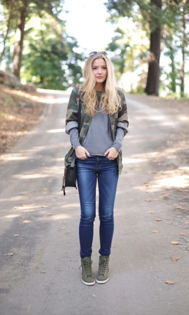 This look showcases how to effortlessly blend comfort and style with wedge sneakers. The outfit is centered around a cozy, gray sweatshirt, paired with skinny blue jeans that perfectly highlight the wedge sneakers. The camouflage jacket adds a trendy edge to the ensemble, making it a great choice for a laid-back day out.