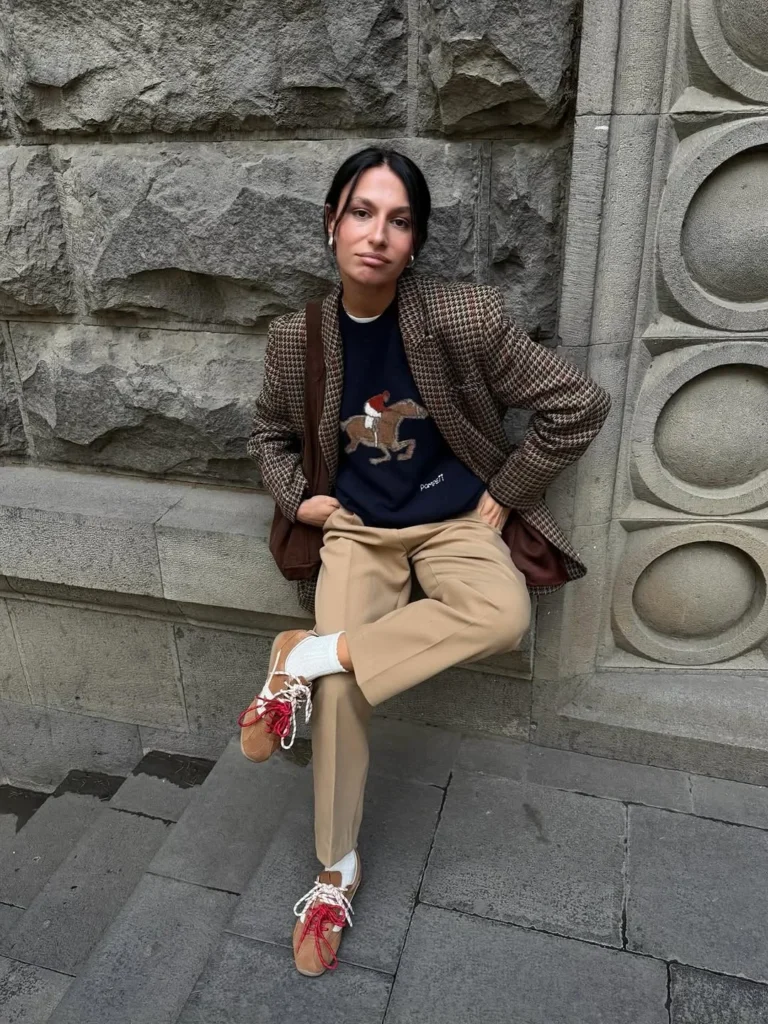 This outfit blends comfort and style effortlessly. A classic crewneck sweater featuring a horse print pairs beautifully with beige trousers, creating a sophisticated yet laid-back vibe. The key statement here is the addition of wedge sneakers that add a modern twist to the look. These sneakers, with their colorful laces, not only provide comfort but also inject a playful edge to the ensemble.