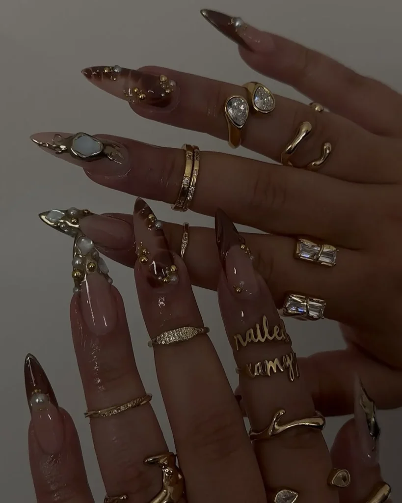 Pearl clusters sit at the peaks and catch every light. Tiny gold beads finish the borders and give jewelry energy without rings. Ask your tech for long almond or stiletto, a clear builder gel, and coffee brown at the tips.