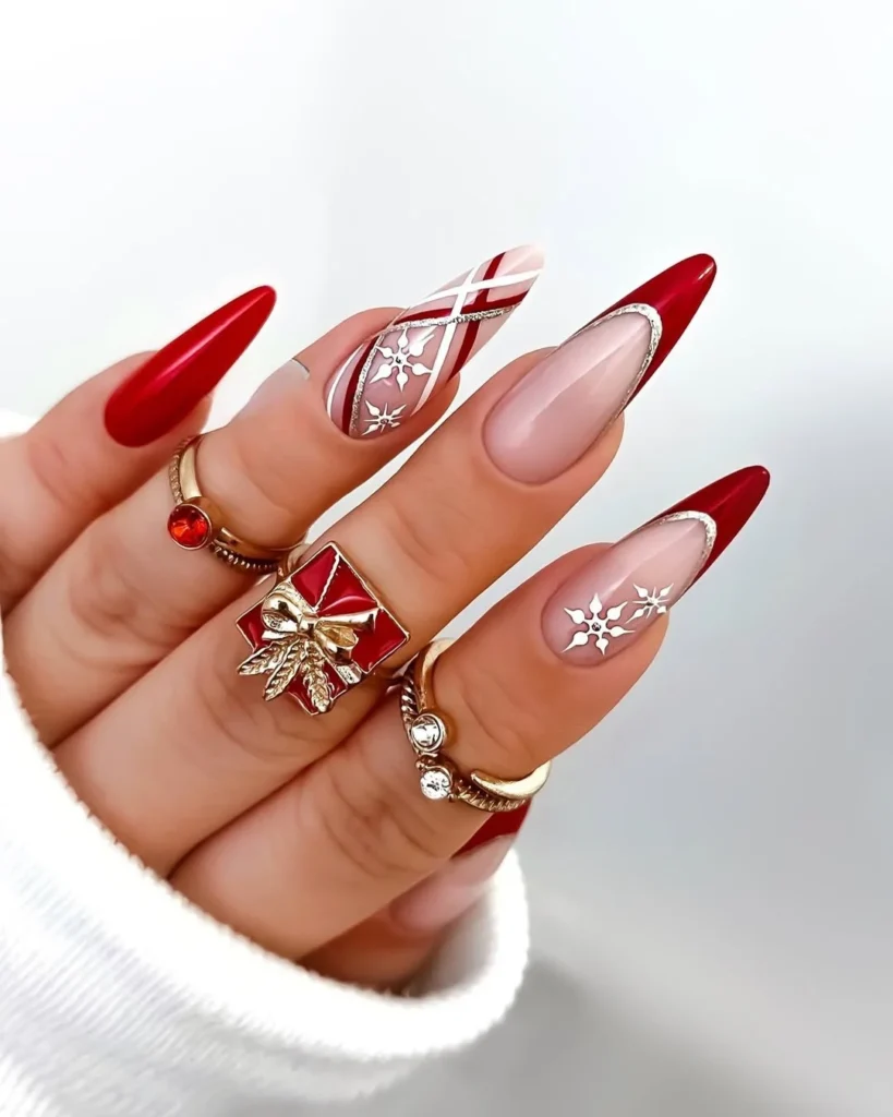 Another shows a delicate snowflake over a sheer base, while the thumb stays glossy red for balance. Ask your tech for long almonds, a neutral pink gel, and bright cherry red.