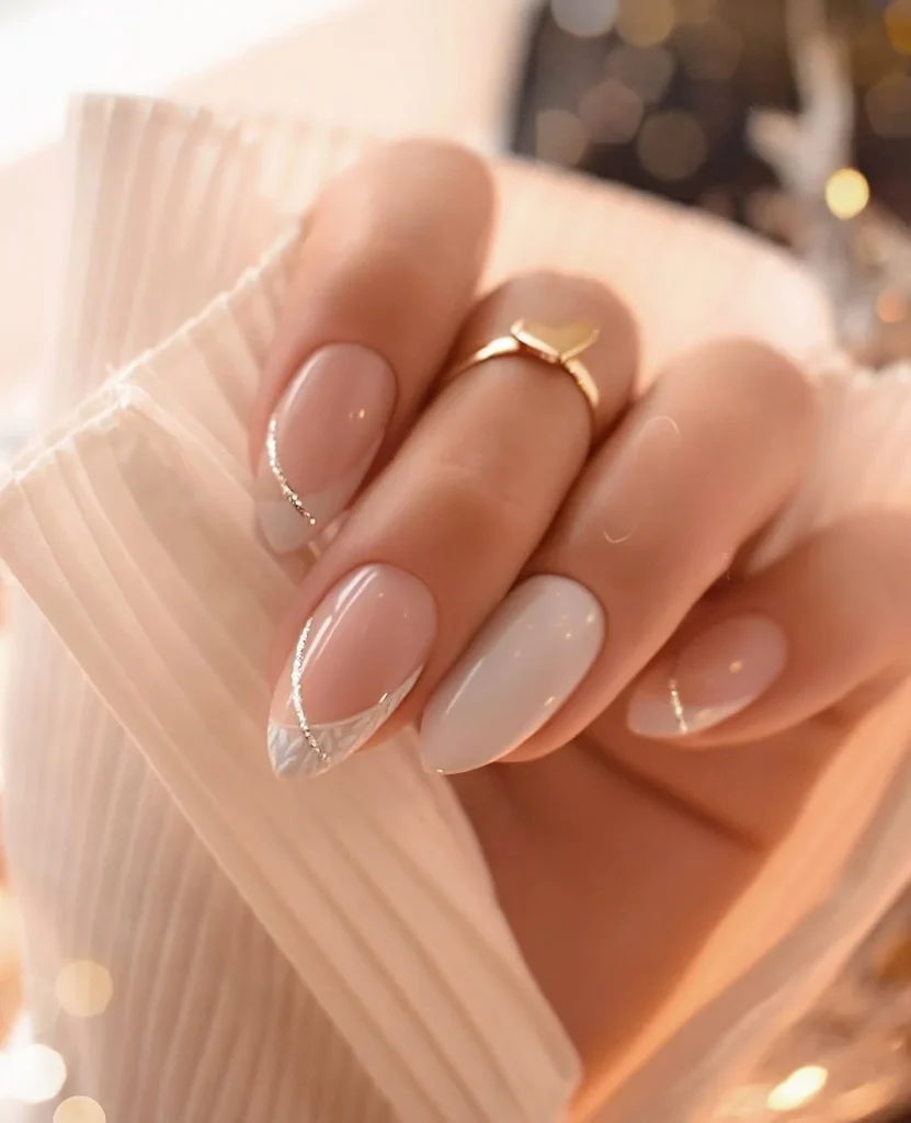 This winter manicure feels elegant and soft. A sheer blush base sets the scene, then slim silver lines sweep across the tips like tinsel. One nail wears a snowy white accent for a crisp, wintry touch.