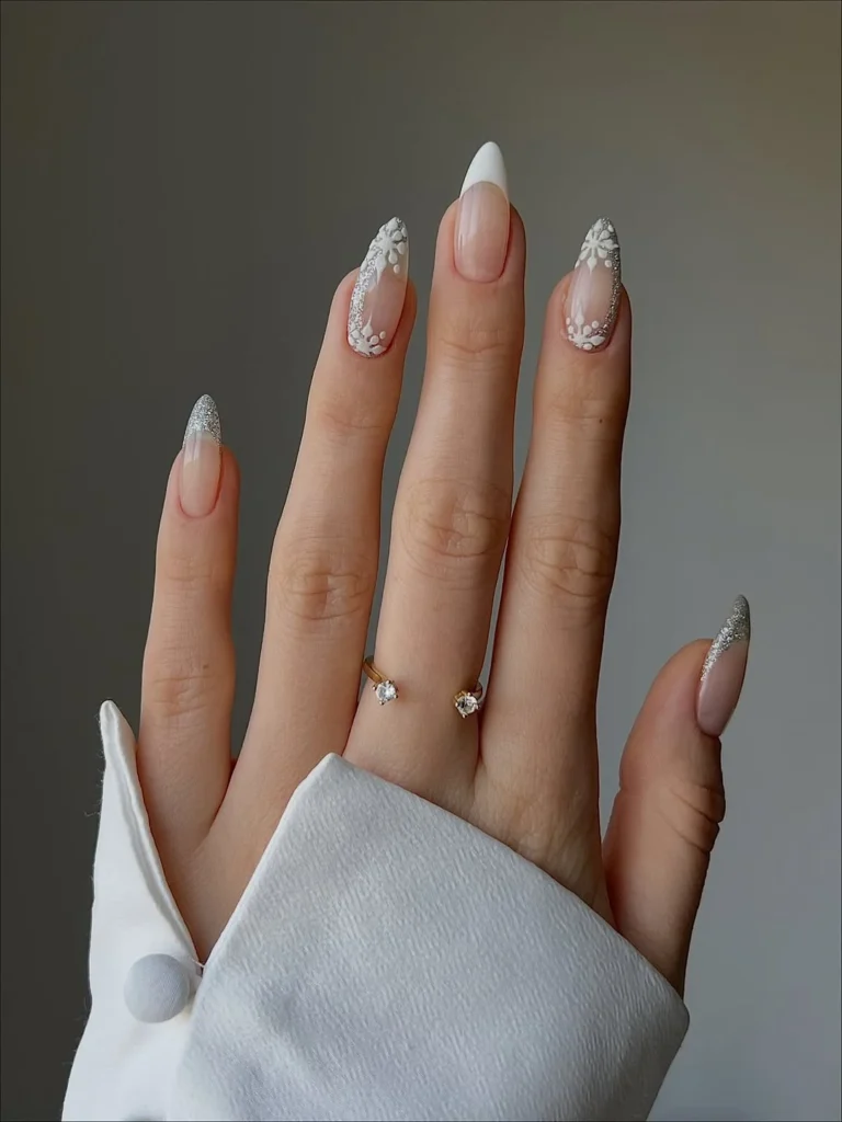 Soft winter magic with a clean twist. A sheer nude base sets the scene while crisp white French tips crown the middle finger. Neighboring nails wear slim silver glitter tips that sparkle like frost. Hand painted snowflakes and tiny petals frame the edges for a lace effect.