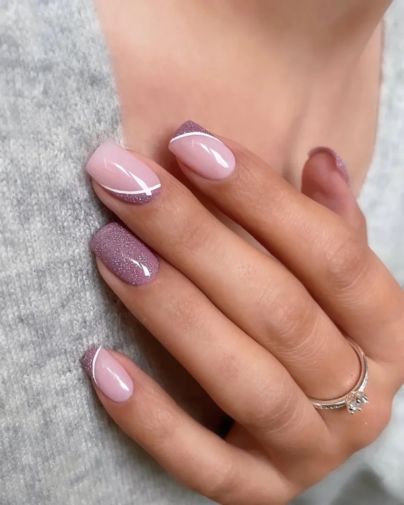 Soft blush meets winter sparkle in this elegant set. Two nails wear a sheer pink base with a curved white ribbon that kisses a mauve glitter tip. The others go full shimmer in the same cozy mauve, catching the light like frost.