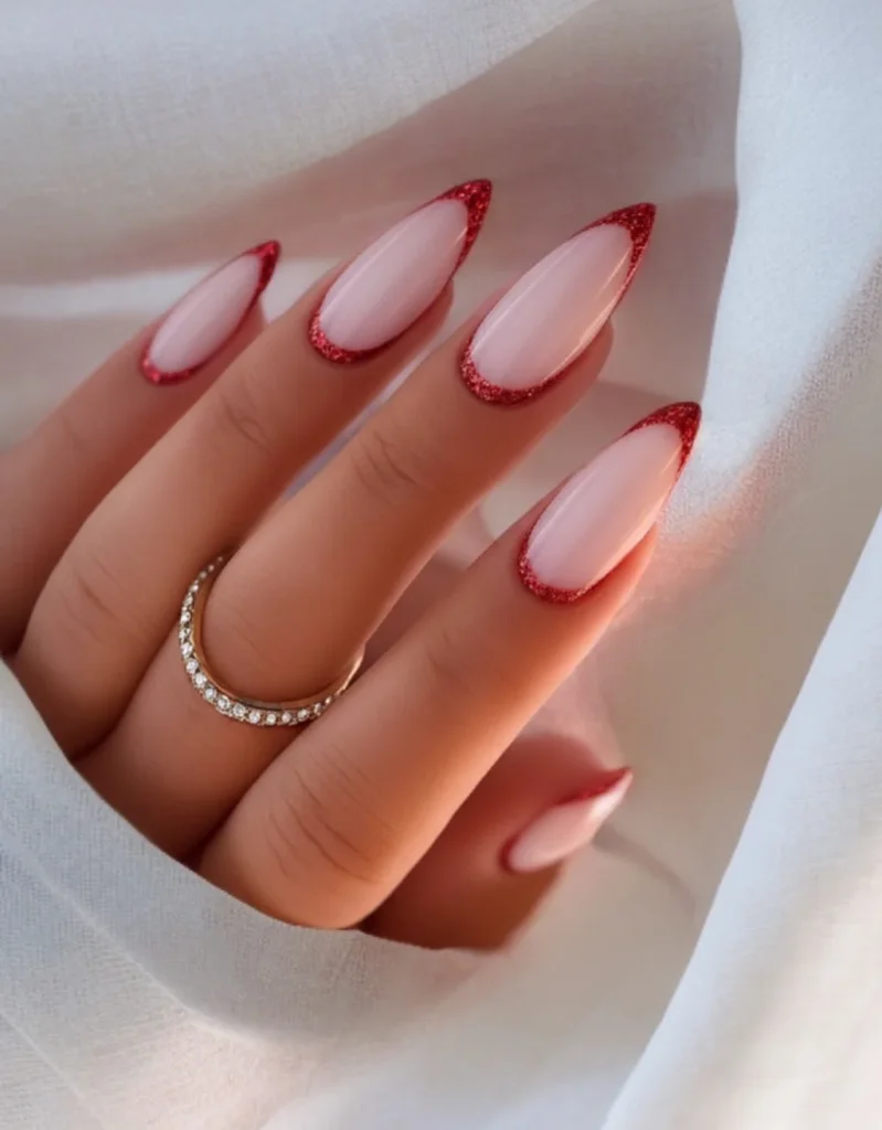 Soft blush meets festive sparkle in this elegant set. A sheer pink base keeps the nails clean while ruby glitter tips trace a delicate crescent along the edge. The almond shape lengthens the fingers and gives a graceful finish.