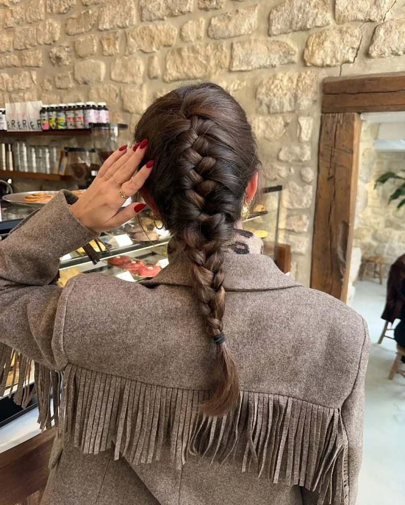 The hair is neatly styled into a classic French braid that runs down the back, creating a refined and organized appearance. The smoothness of the braid contrasts beautifully with the relaxed, fringed texture of the coat, making it a balanced and versatile style.