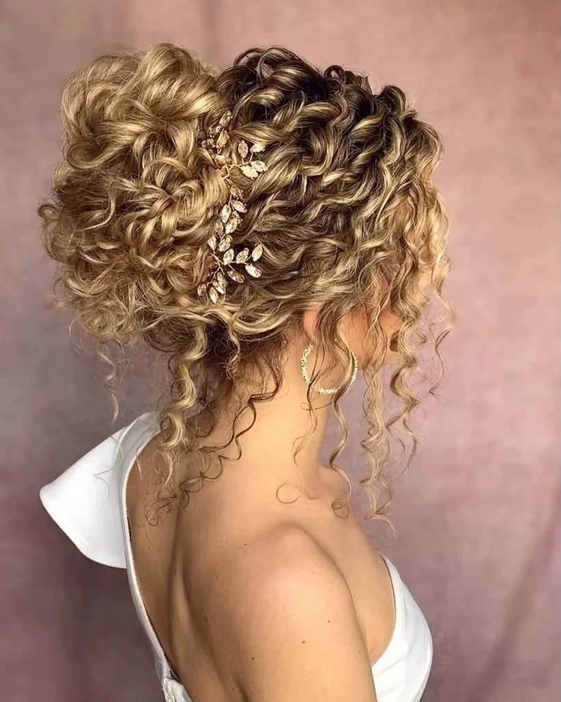 The updo is styled into a high, voluminous bun, while loose curls frame the face, adding a soft touch. A delicate hair accessory with floral details adds a touch of glamour, elevating the look even further.