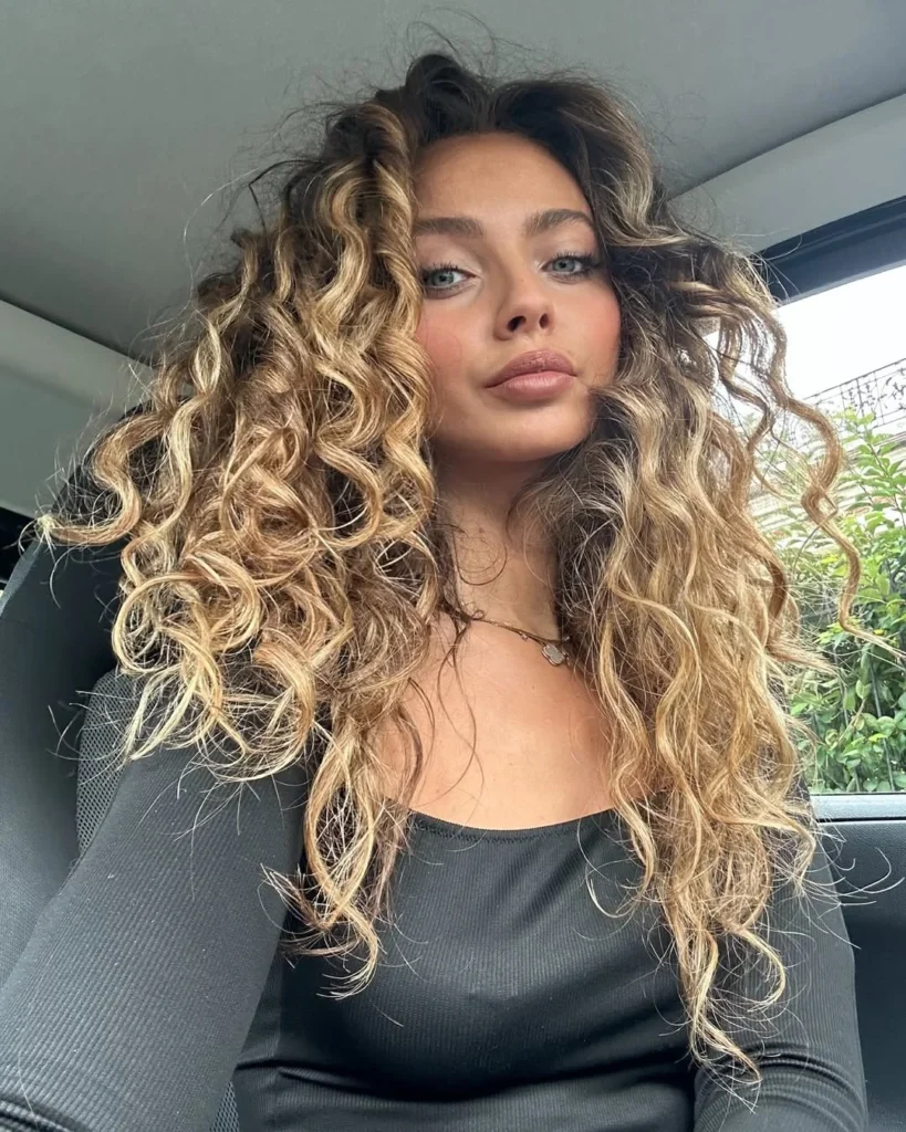 This voluminous curly hairstyle is both lively and elegant, making it a great choice for winter 2025. The natural curls are bouncy and full of texture, with the added dimension of caramel highlights that catch the light beautifully.