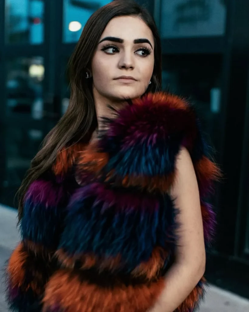 This chic winter look combines bold fashion with an effortlessly stylish hairstyle. The model’s long, smooth hair flows gracefully, complementing the rich, vibrant hues of her fur vest.