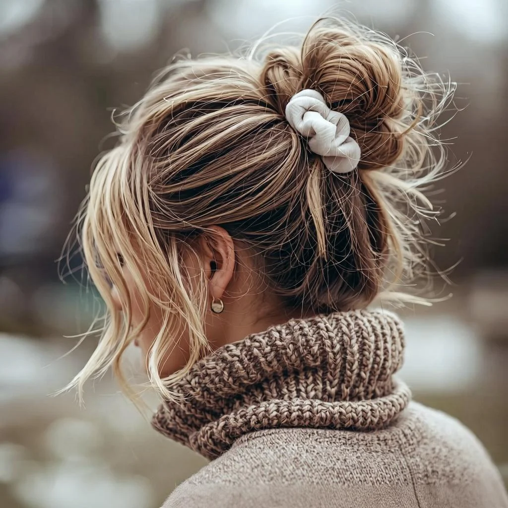 This effortlessly chic hairstyle embraces the cozy vibes of winter. The loose, textured bun at the crown is styled with natural, tousled layers, adding volume and softness. A white scrunchie brings a playful touch, keeping the look casual yet stylish.