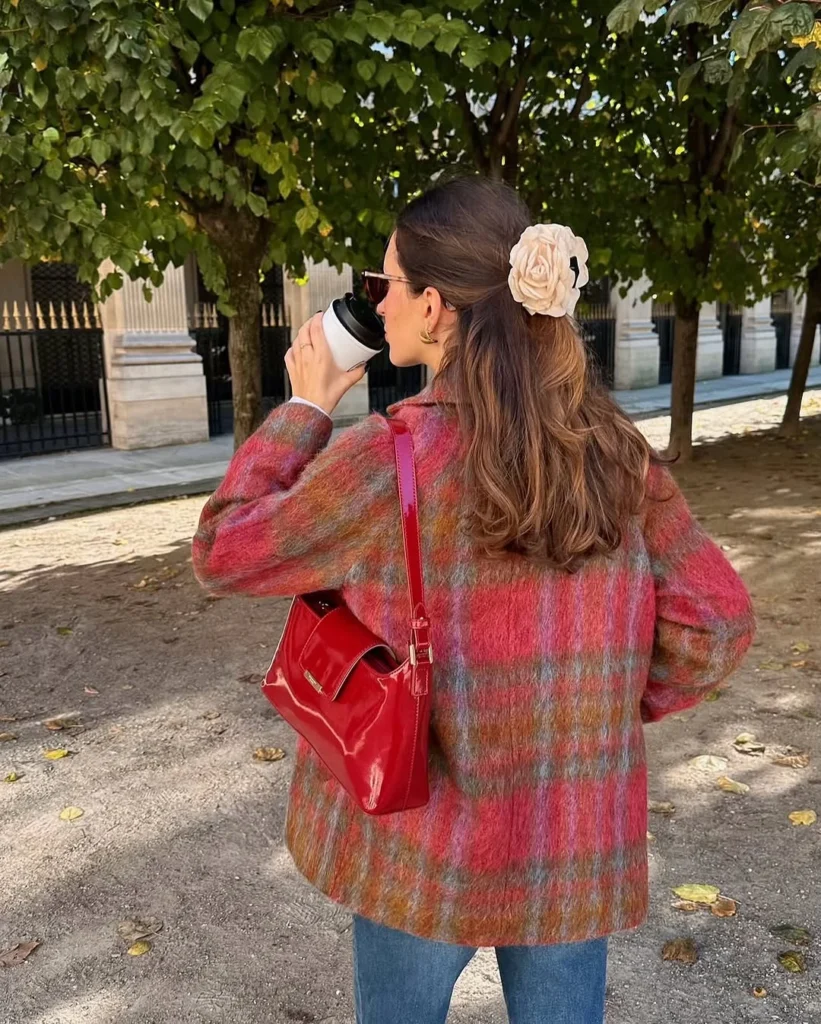 Paired with a cozy plaid jacket and a vibrant red handbag, the look exudes both warmth and sophistication. This hairstyle is perfect for a walk in the crisp winter air or a cozy café outing, effortlessly blending comfort with a touch of femininity.
