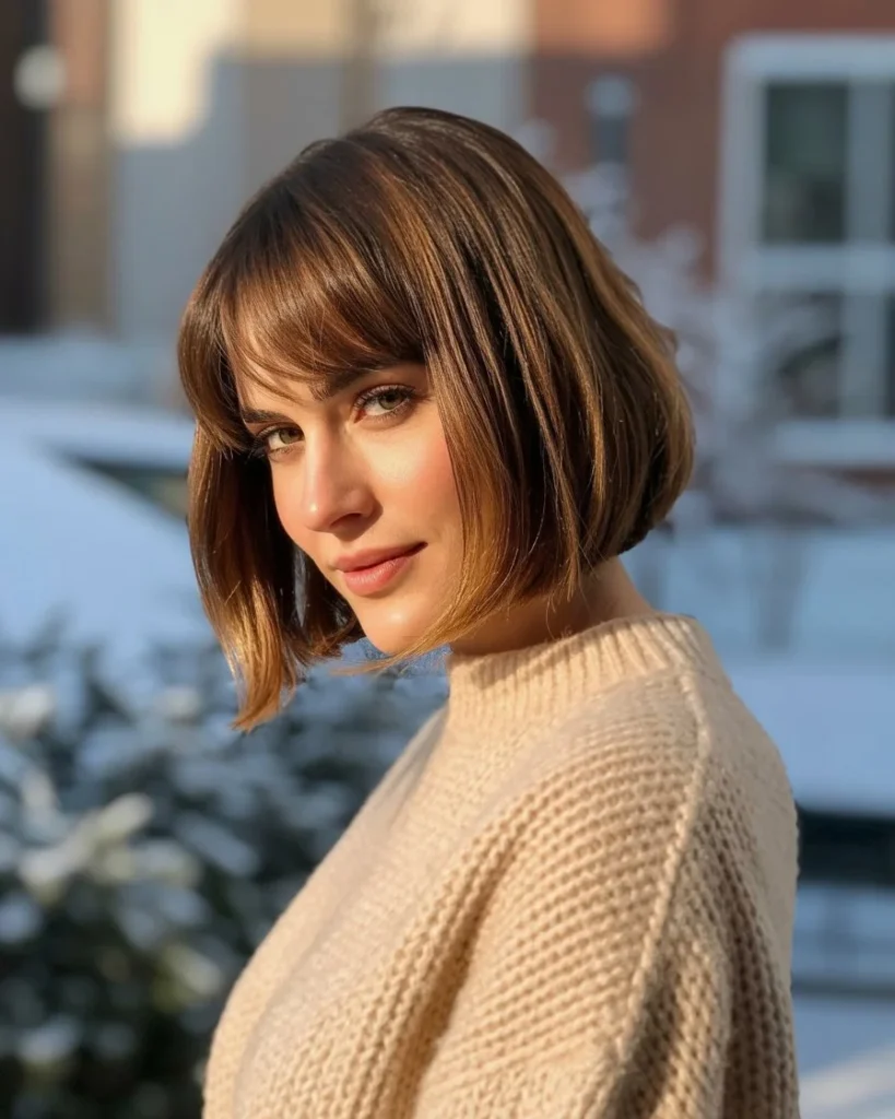Ask your stylist for a blunt or slightly layered bob with curtain or wispy bangs. Style it with a round brush and blow dryer for volume and a soft finish. It’s chic, modern, and pairs perfectly with chunky scarves or oversized coats.