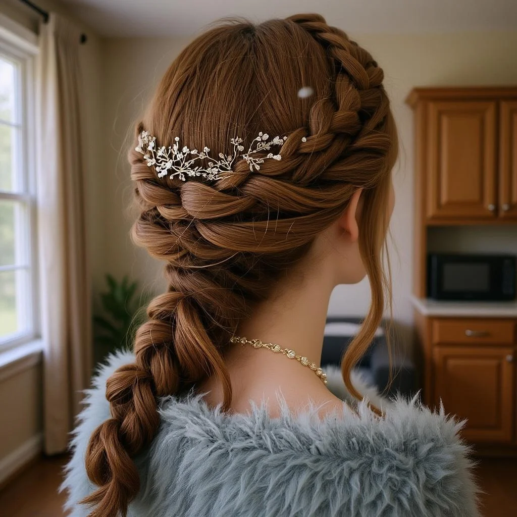 This elegant winter hairstyle combines intricate braids with delicate accessories for a truly refined look. The hair is beautifully braided into a loose, romantic style, with soft curls flowing freely at the bottom.