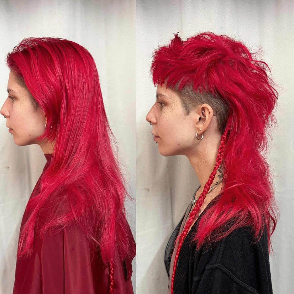 For women who love standing out, this fiery red mullet is a fearless expression of individuality. The dramatic contrast between shaved sides and voluminous layers adds attitude and edge, while the bright crimson hue injects instant confidence.