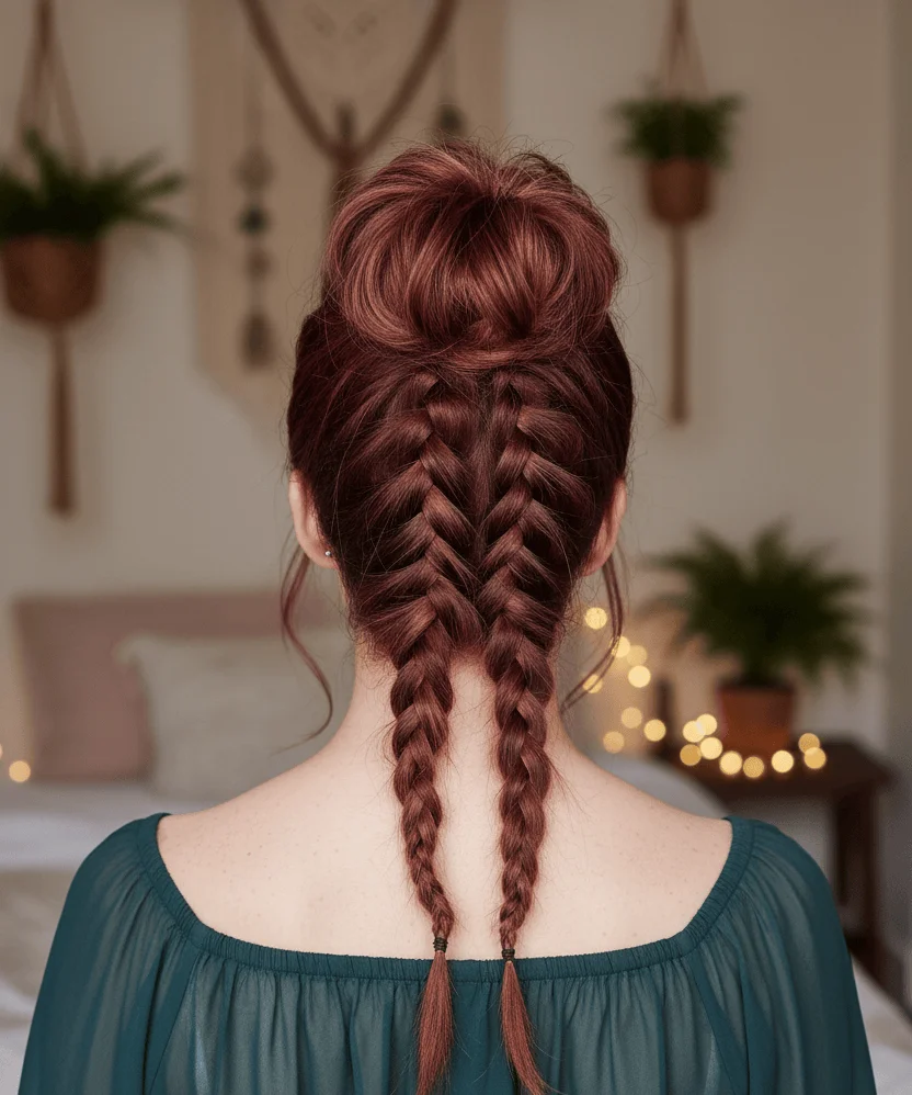 For women who love a polished yet playful look, the upside-down braided bun is a winter favorite. The inverted braid adds a creative twist to the classic top bun, blending structure with a touch of whimsy.
