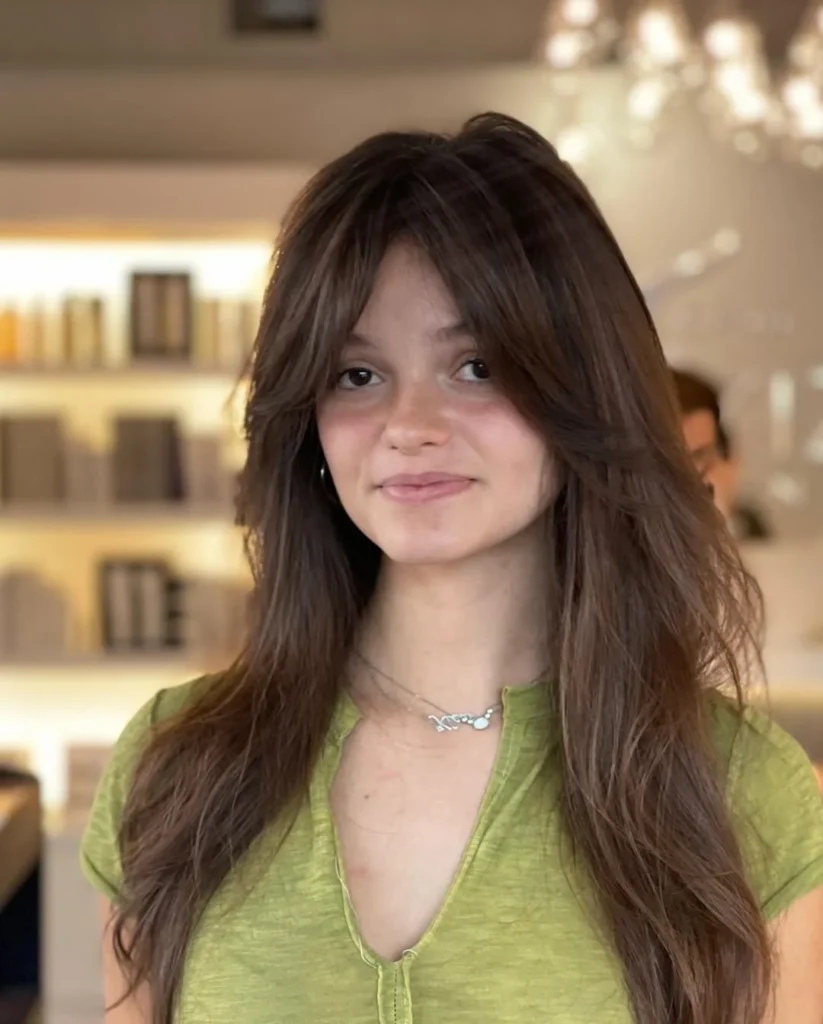 For women who adore a soft, effortless charm, curtain bangs with long layers bring warmth and movement to winter hairstyles. The face-framing bangs gently blend into cascading strands, creating a balanced and romantic flow that flatters every face shape.
