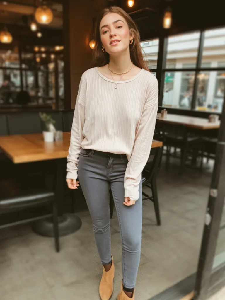 Paired with high-waisted, slim-fit jeans, the outfit exudes effortless style. Beige ankle boots complete the look, adding a chic touch that can easily transition from a coffee date to a casual gathering with friends.