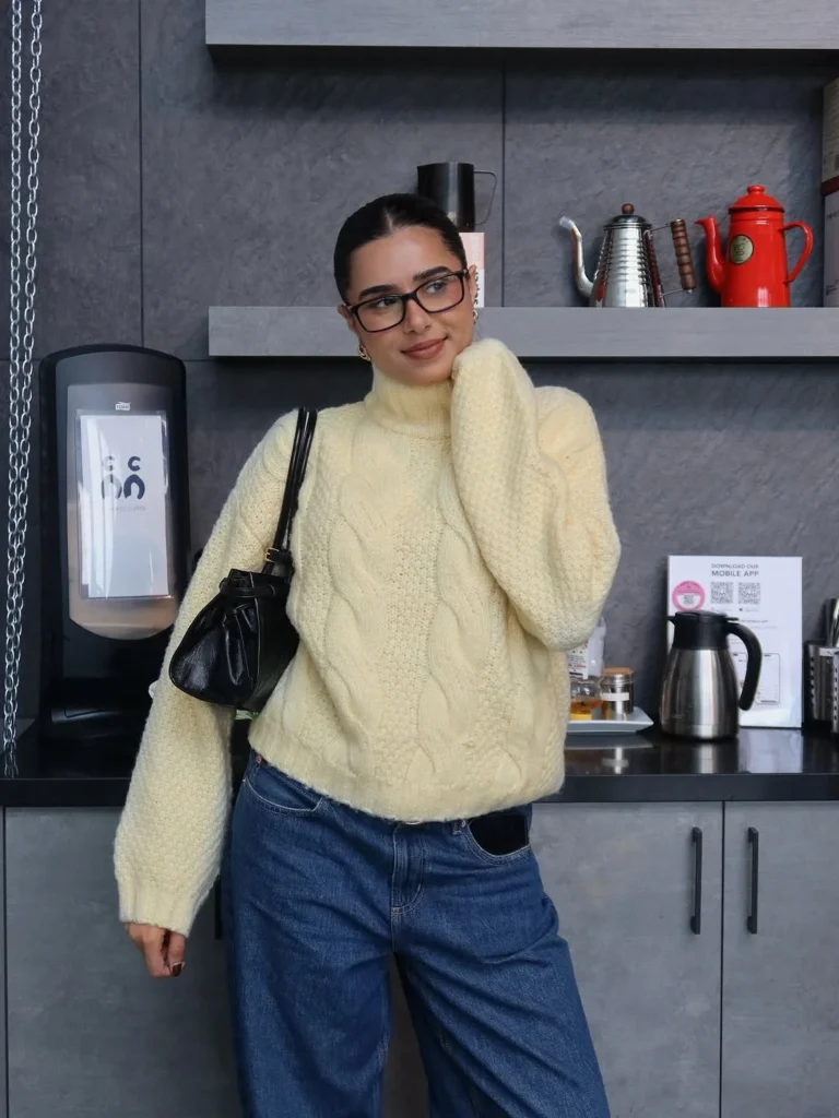 With its turtleneck design, the sweater provides both warmth and style, while the loose fit allows for easy movement. Paired with high-waisted denim and accessorized with a small black bag, this look strikes the perfect balance between chic and comfortable.