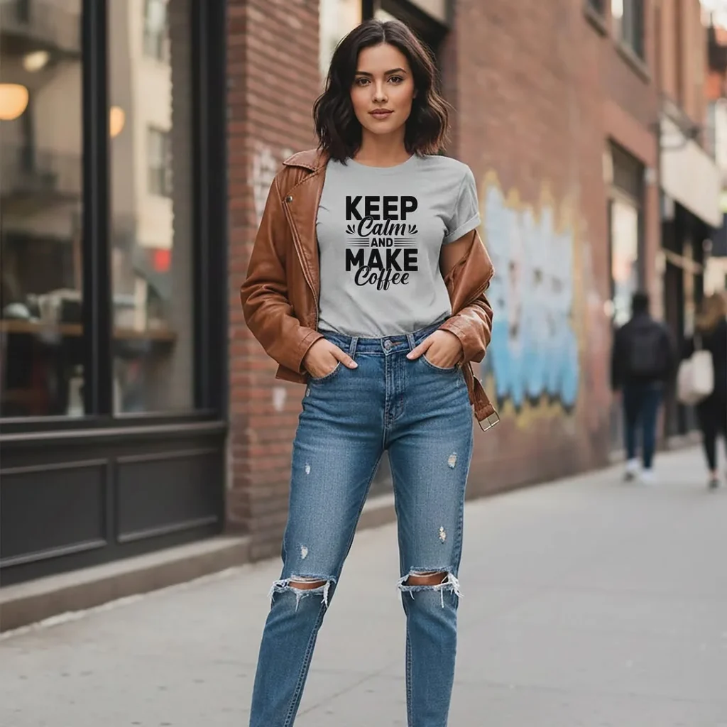 A “Keep Calm and Make Coffee” graphic tee paired with ripped jeans exudes a fun, relaxed vibe. The light grey color of the tee contrasts beautifully with the warm brown leather jacket, adding an edge to the casual look.