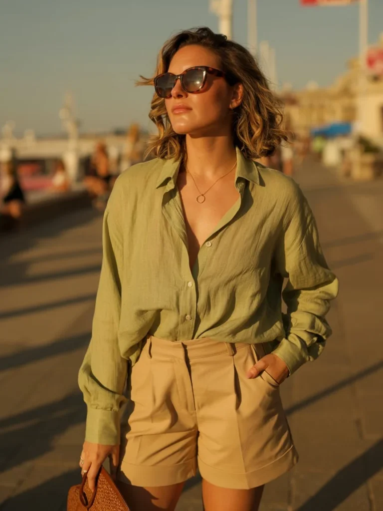 10. Light Green Button-Down Shirt with Beige Shorts