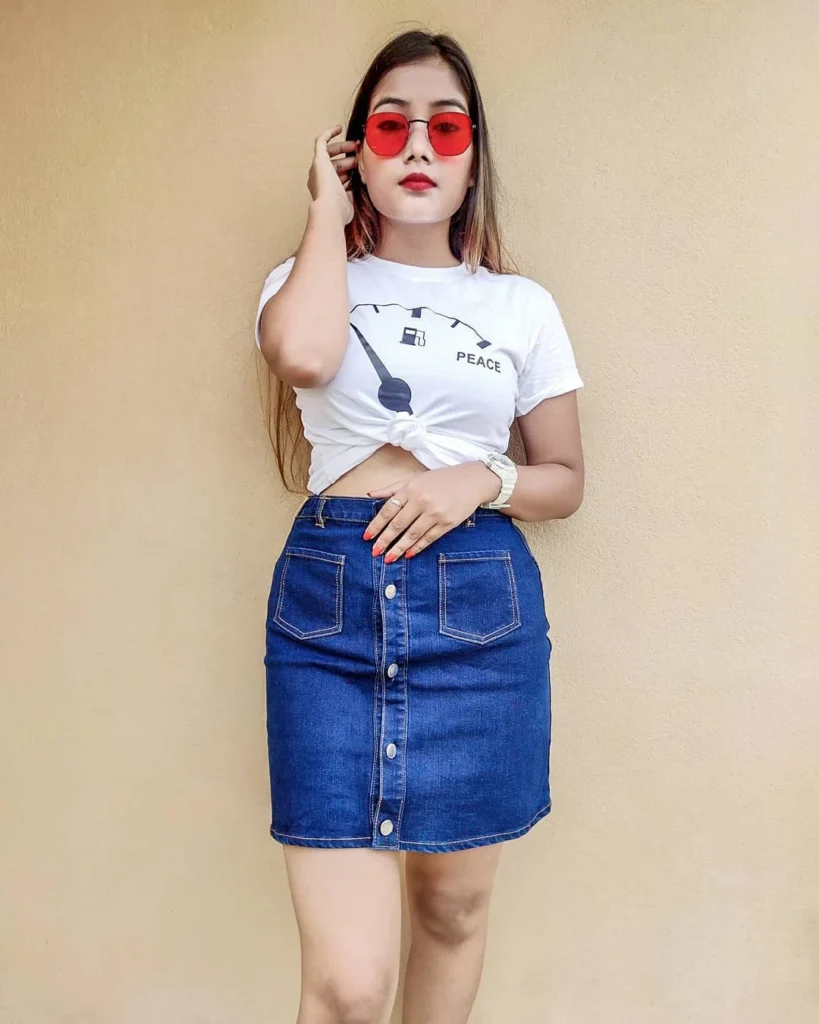 This effortless look combines a simple white graphic tee with a classic denim skirt, ideal for relaxed days out. The shirt features a quirky “peace” graphic that adds personality to the ensemble, while the fitted denim skirt enhances the silhouette with a timeless appeal.