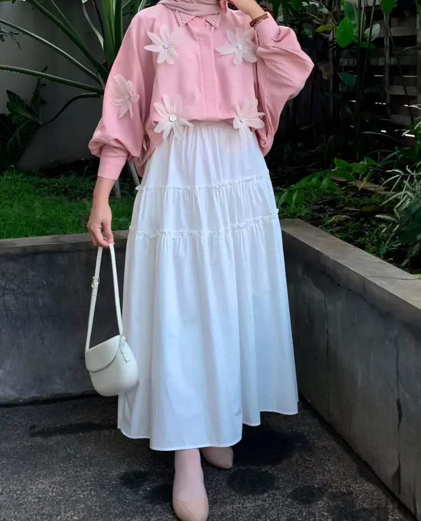 Paired with a flowy white tiered skirt, the outfit exudes a soft, romantic vibe. A white handbag and nude shoes complete the look, making it perfect for a sunny day out or a relaxed brunch date.