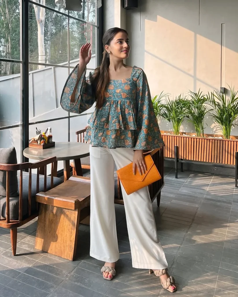 6. Floral Peplum Top with Bell Sleeves and White Wide-Legged Pants