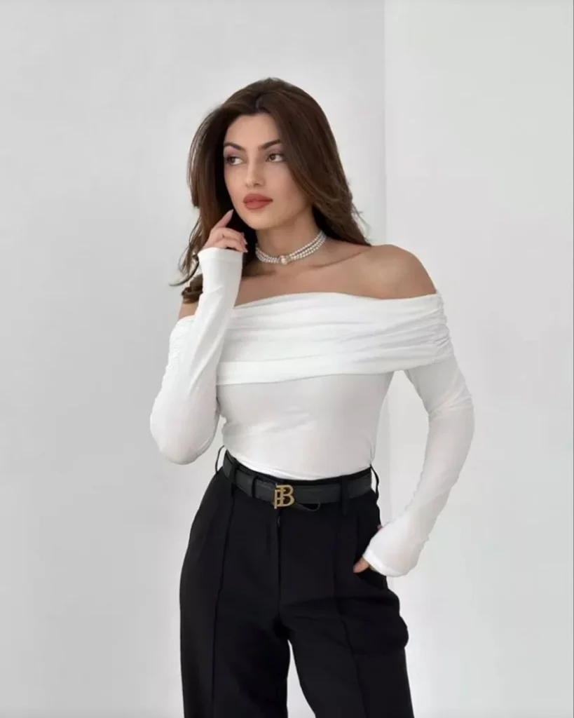 This chic off-shoulder top in soft white creates an effortlessly elegant look. The ruched detail across the neckline adds texture and depth, making the simple top stand out. Paired with high-waisted black trousers, the outfit balances modern sophistication with casual ease.